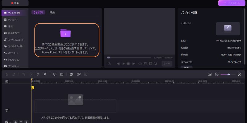 編集画面が表示されたら、【フォルダマーク】をクリックして、スライドショー動画に使用する画像や動画、音楽素材などを追加しましょう。
